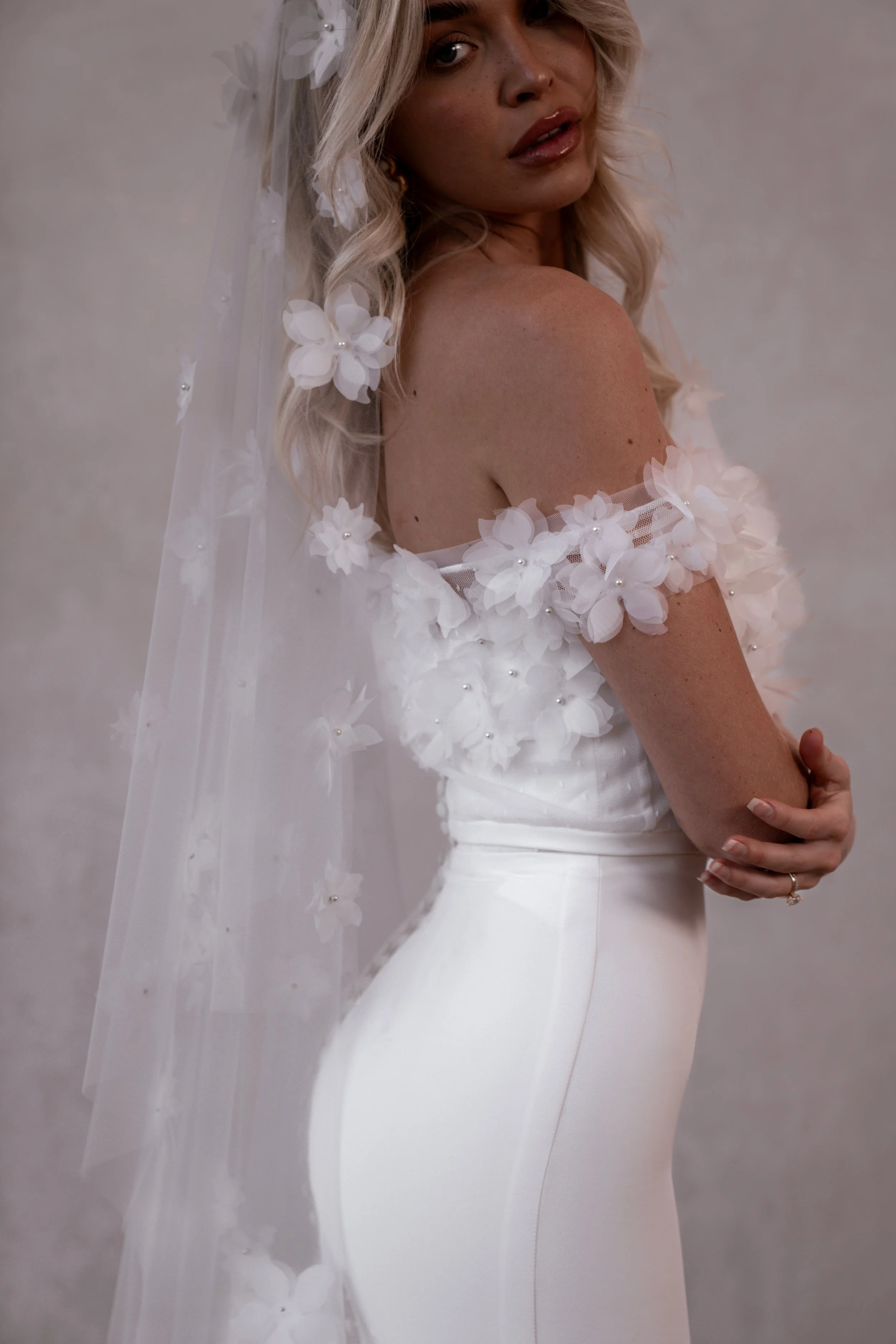 Featuring a strapless design made from a combination of supportive French Crepe and a texture-rich, spotted tulle bodice. Pair Marley with her spotted tulle detachable off-the-shoulder top, adorned with romantic 3D florals for a touch of unique femininity. Each delicate Marley flower is lovingly hand-crafted, making this design a truly precious and charming addition to the Never Before collection.
